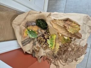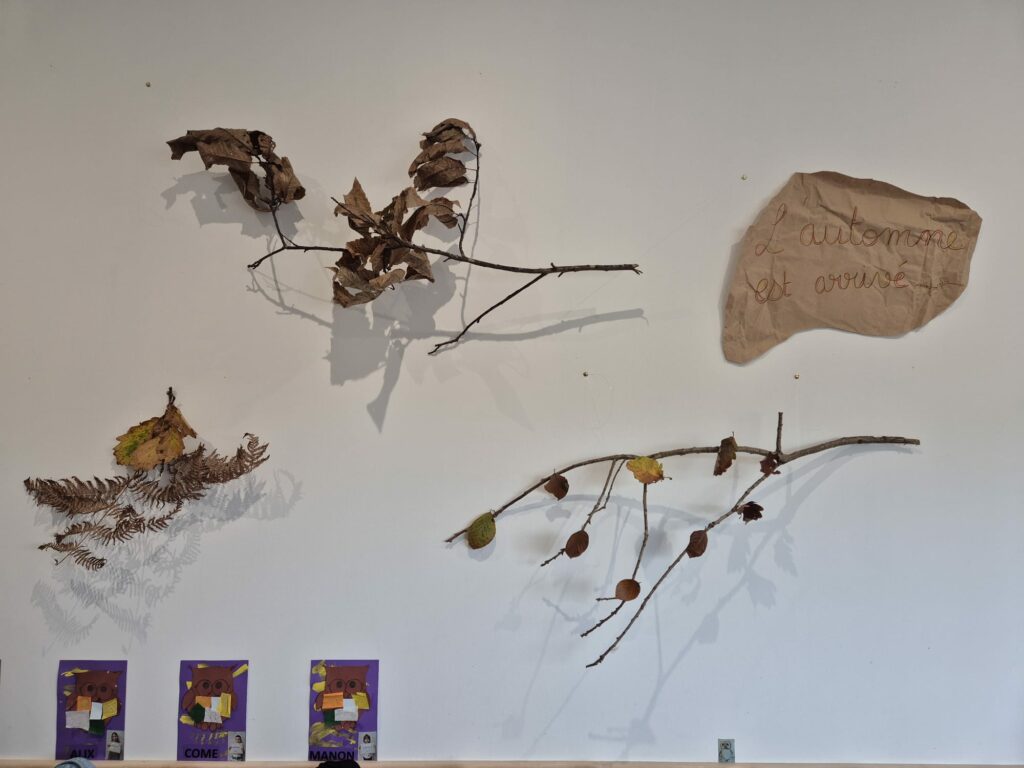 Nous avons aussi observé la récolte de Gaspard qui avait rapporté des trésors d’automne : glands, marrons, noisettes. Nous avons aussi décoré la classe avec de belles branches et des feuilles ramassées dans la nature, donnant à notre salle des airs de forêt enchantée.