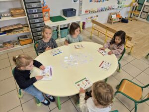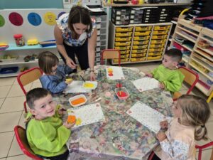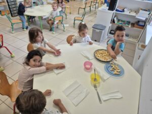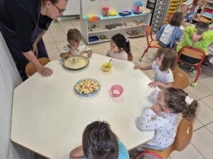 Les enfants ont exploré les fruits et légumes de saison : pommes, poires, potirons, châtaignes… De quoi éveiller la curiosité et donner envie de goûter ! Ensemble, nous avons préparé de délicieuses tartes aux pommes, qui ont embaumé la classe et régalé les petits gourmands.