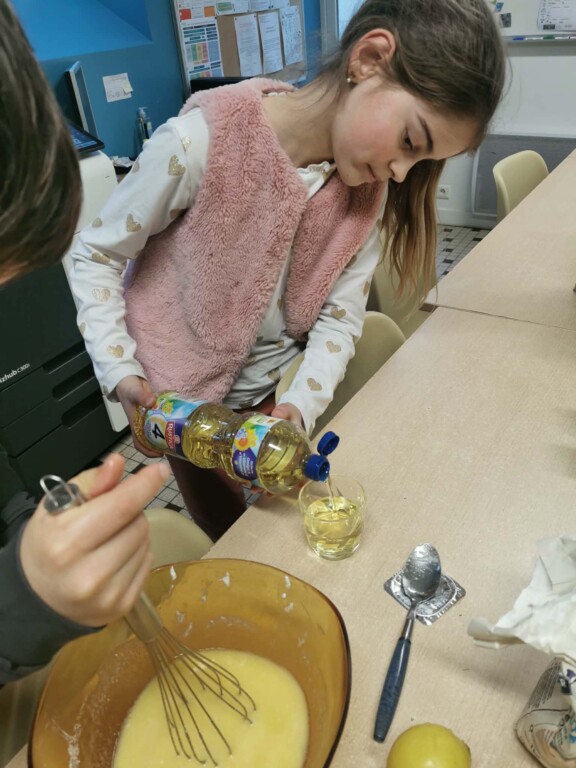 Cette semaine, les élèves nés pendant le plus court mois de l’année ont préparé un délicieux gâteau au yaourt au citron! Notre équipe de pâtissiers en herbe était composée de Romane (du 14 février), Noa(du 8 ) , Victoria (du 6 février)chez les petitis; en CE2 Nino (du 6), en CM1, Victor (du 9 )et Maé (le 3), et en CM2 Ezéchiel (du 8) et Romanovna (du 1er). Joyeux anniversaire à eux!!!